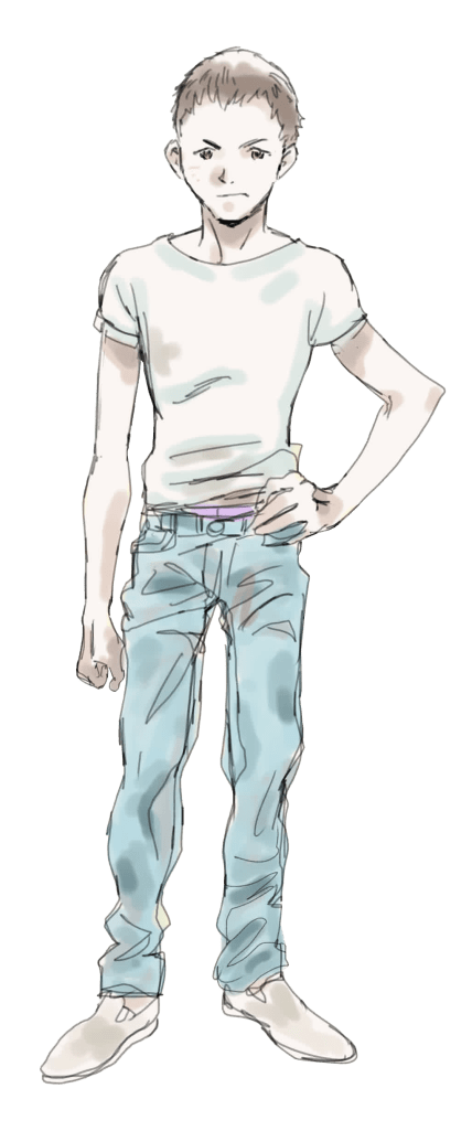 He has a caring, brotherly disposition and is looked up to by those around him because of his skill in fighting. He’s been friends with Boco since kindergarten. He lives with his father in an apartment complex. His real name is Satoru Matsuda. He is 12 years old